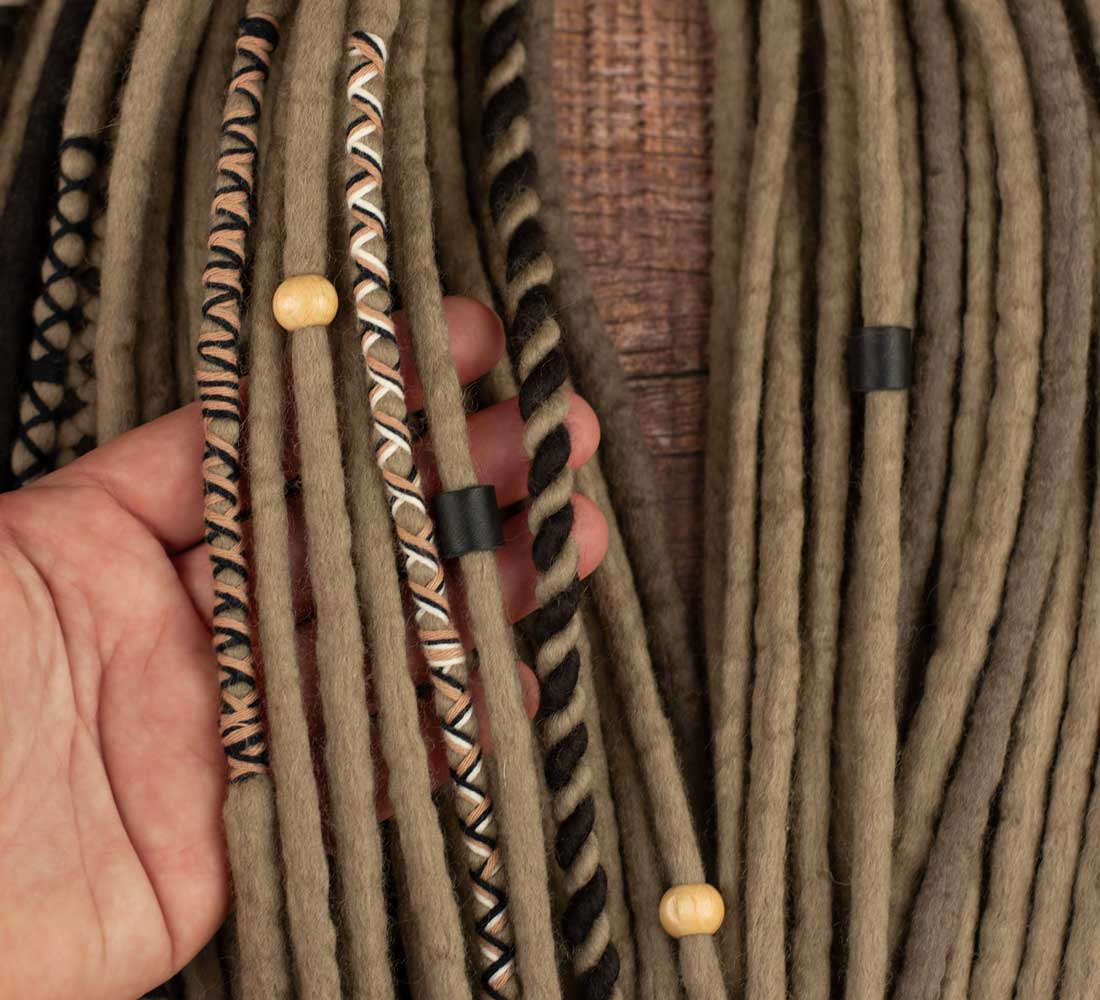The mill dyed wool and yarn is toxic free, and complies with the OEKO-TEX 100 and GOTS requirements. We use high quality mulesing free extra fine merino wool for dreads. The dreadlocks are decorated with cotton yarn. We make the dreads with wet felting technique.