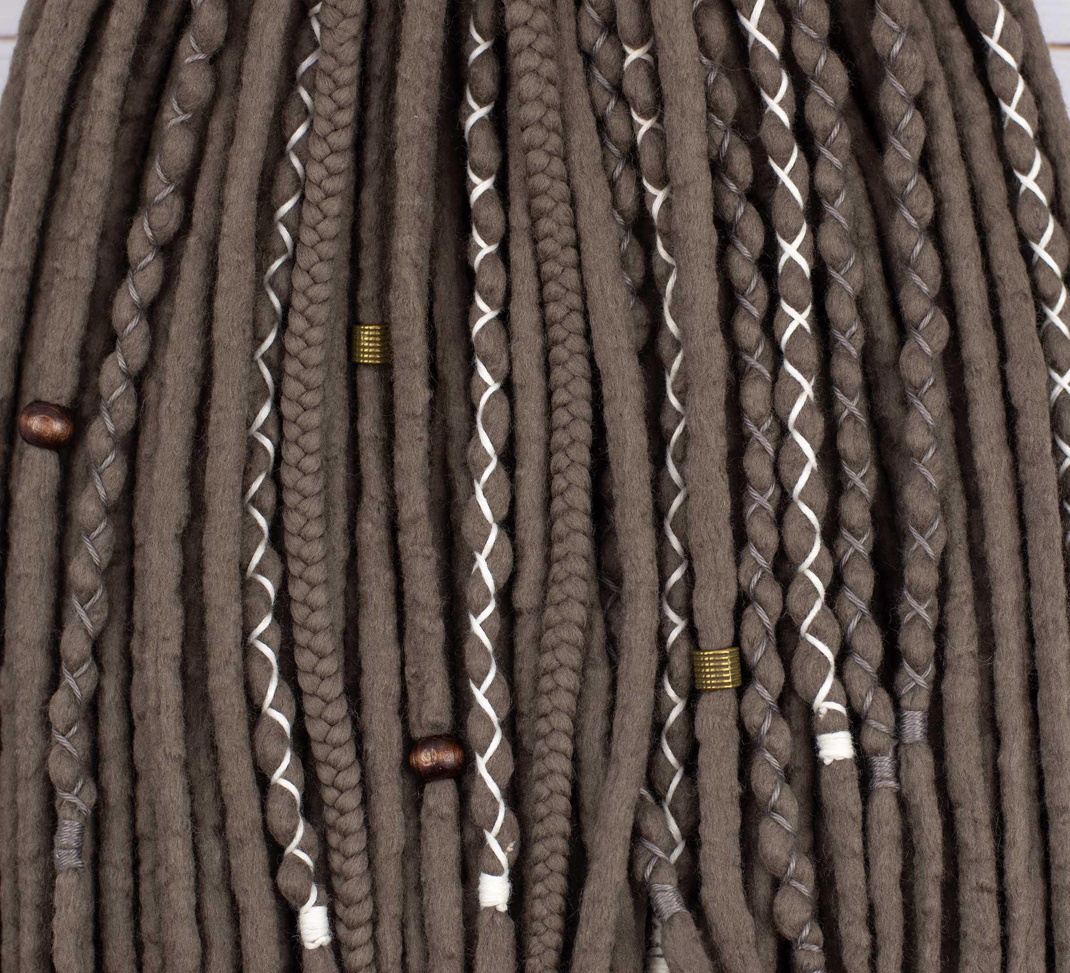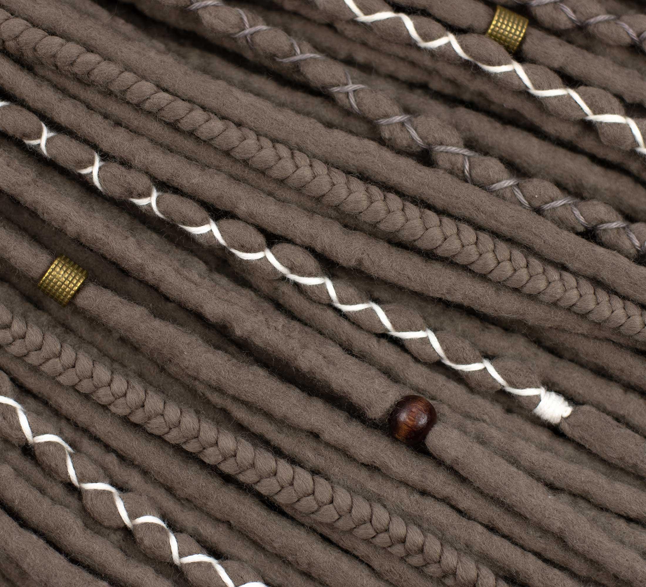 The mill dyed wool and yarn is toxic free, and complies with the OEKO-TEX 100 and GOTS requirements. We use high quality mulesing free extra fine merino wool for dreads. The dreadlocks are decorated with cotton yarn. We make the dreads with wet felting technique.