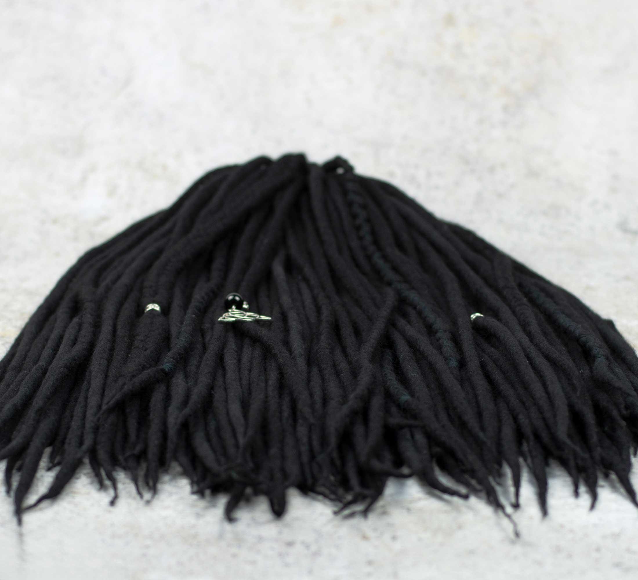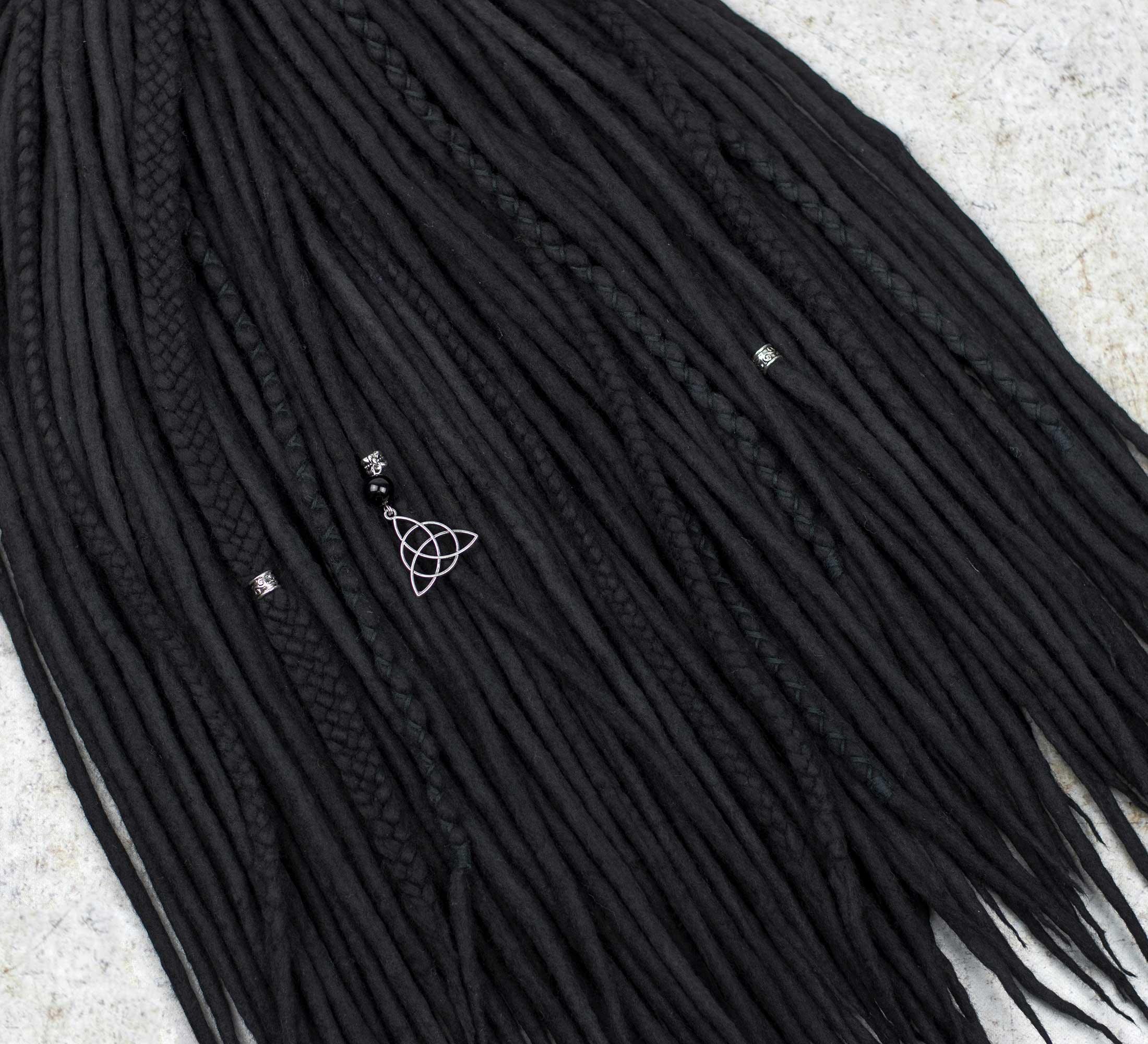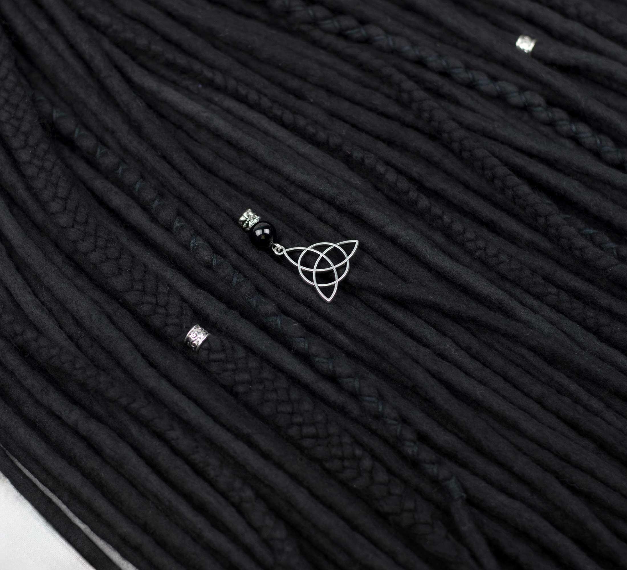Are you ready to boost your personality and confidence with this classic color? The braids and onyx crystal triquetra charm create the uniqueness of this must-have black set. Wool dreads are made of natural materials and the extensions are soft, durable and easy to maintain.