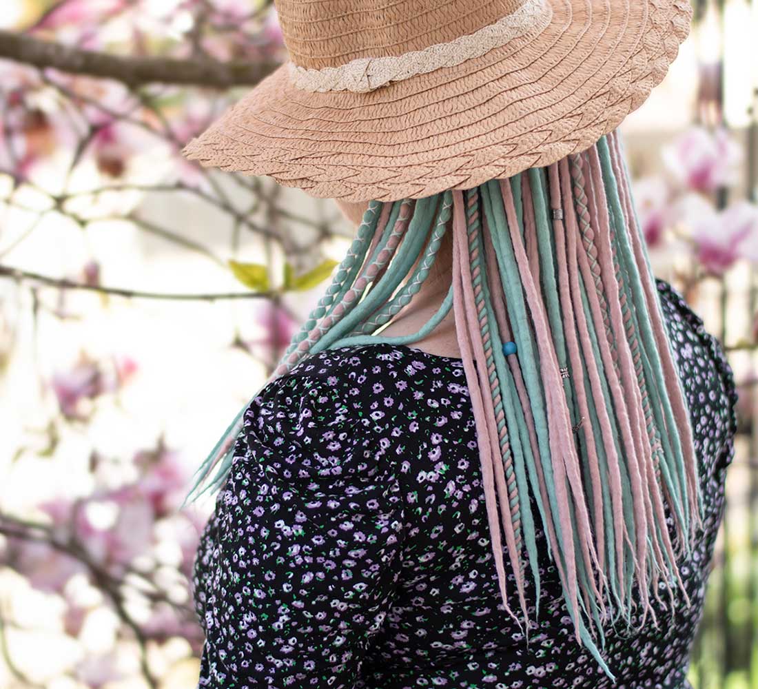 The mill dyed wool and yarn is toxic free, and complies with the OEKO-TEX 100 and GOTS requirements. We use high quality mulesing free extra fine merino wool for dreads. The dreadlocks are decorated with cotton yarn. We make the dreads with wet felting technique.