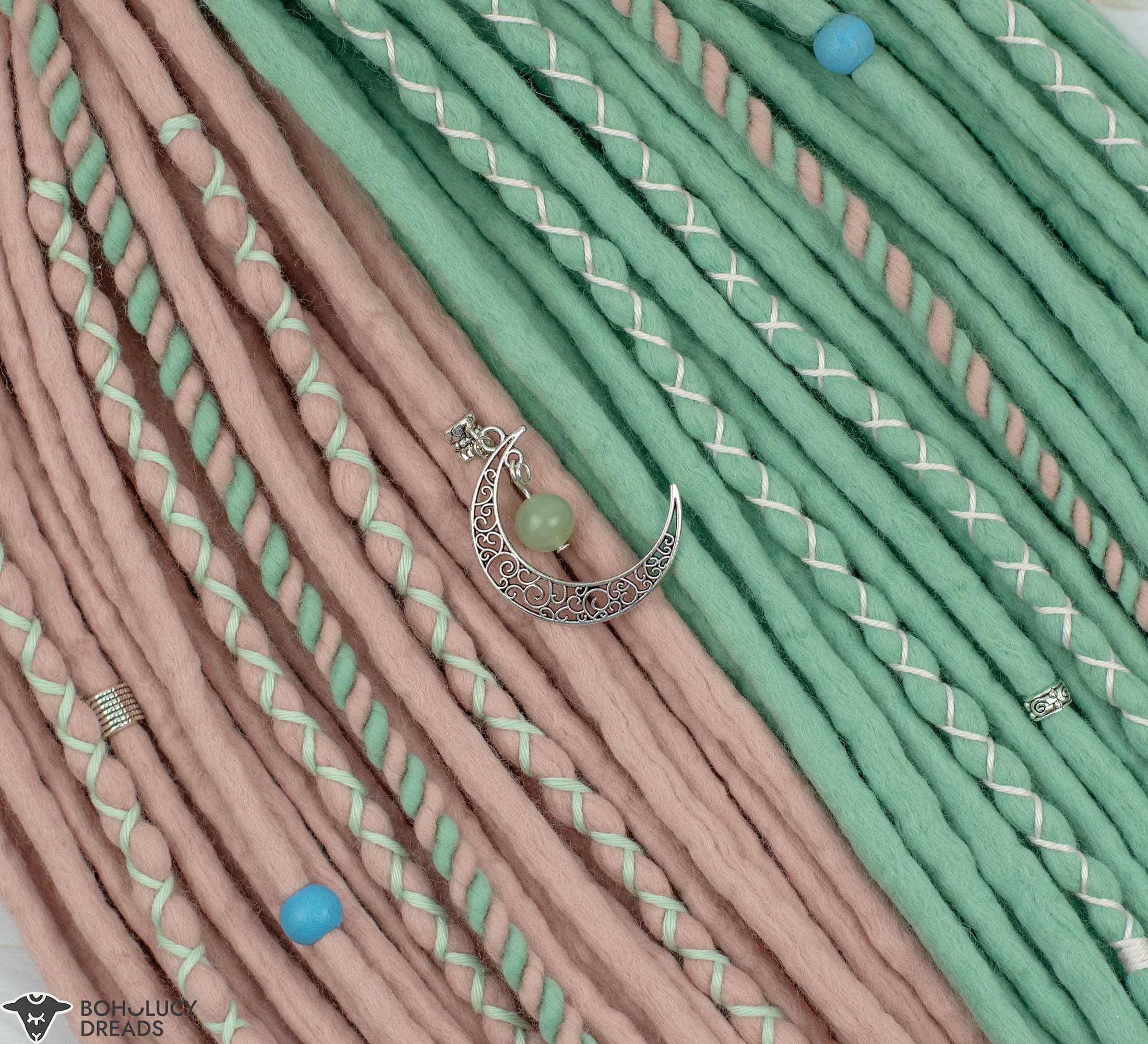 Pastel-colored wool dreads radiate a sense of joy, calm and positivity. They evoke images of soft spring flowers, cotton-candy skies and carefree summer days. By incorporating these mint and shell tones into your hairstyle, you can add a light and cheerful mood to your look. The pastel wool dreadlocks with Chinese jade crystal become part of your personality, allowing your individuality to stand out from the crowd and convey a positive energy that can lift your mood and those around you.