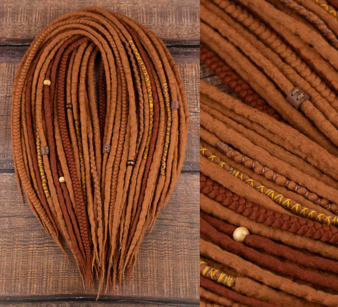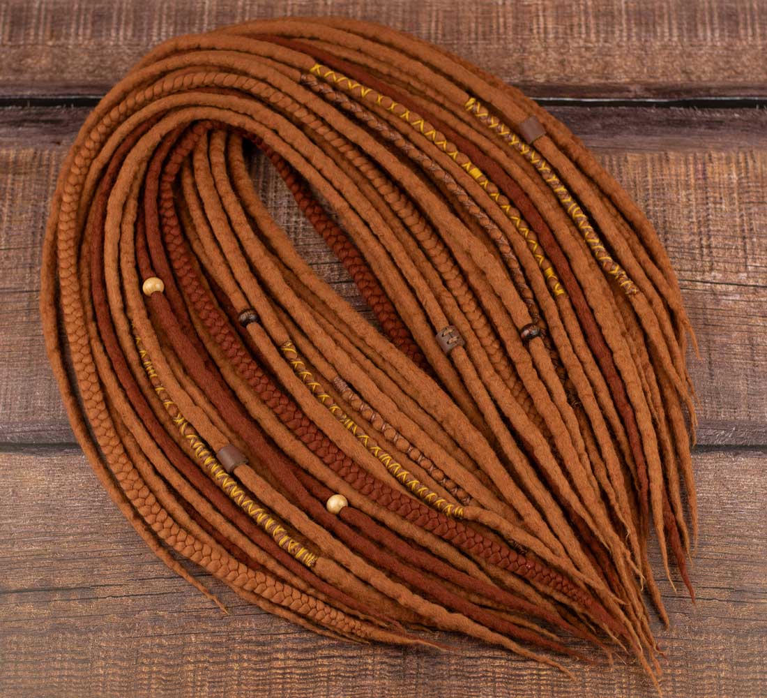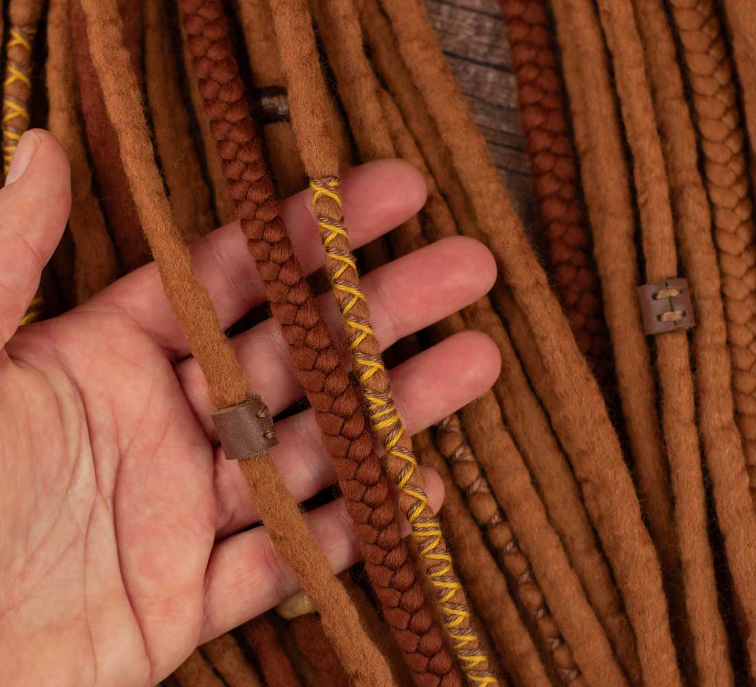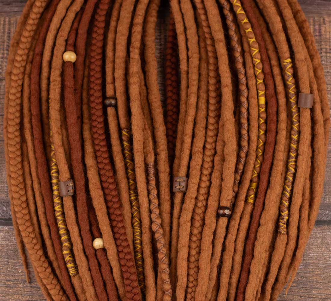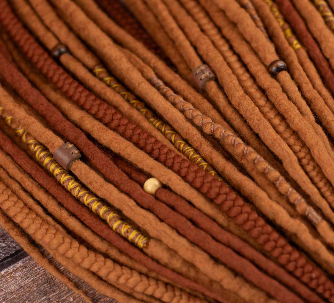 Bring warmth and energy to your style with our Ginger Viking wool dreads. These copper-toned dreadlock extensions are handmade from extra-soft merino wool, as gentle as they are eye-catching, so your scalp stays comfortable and irritation-free. The braids and X-decorated accents add texture to each set, letting your individuality shine.
