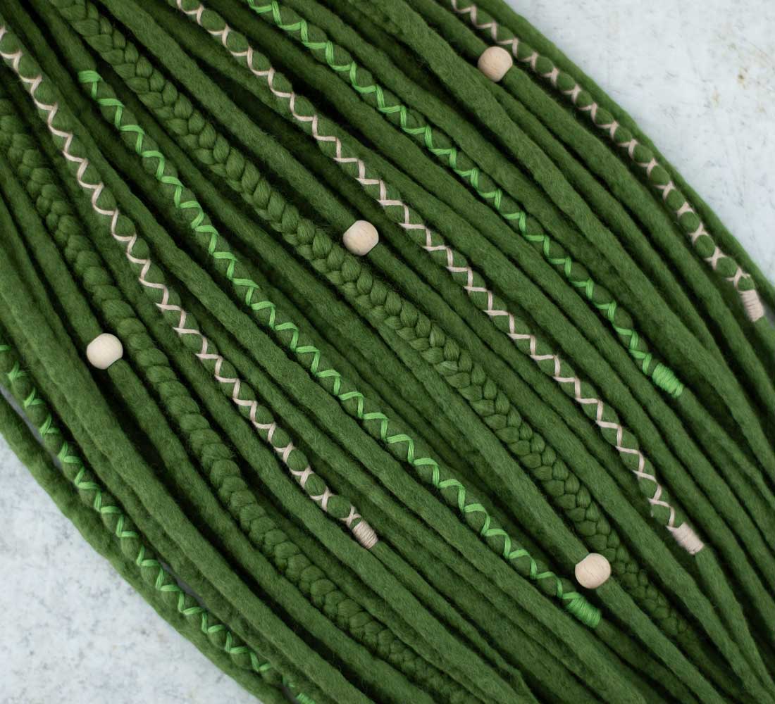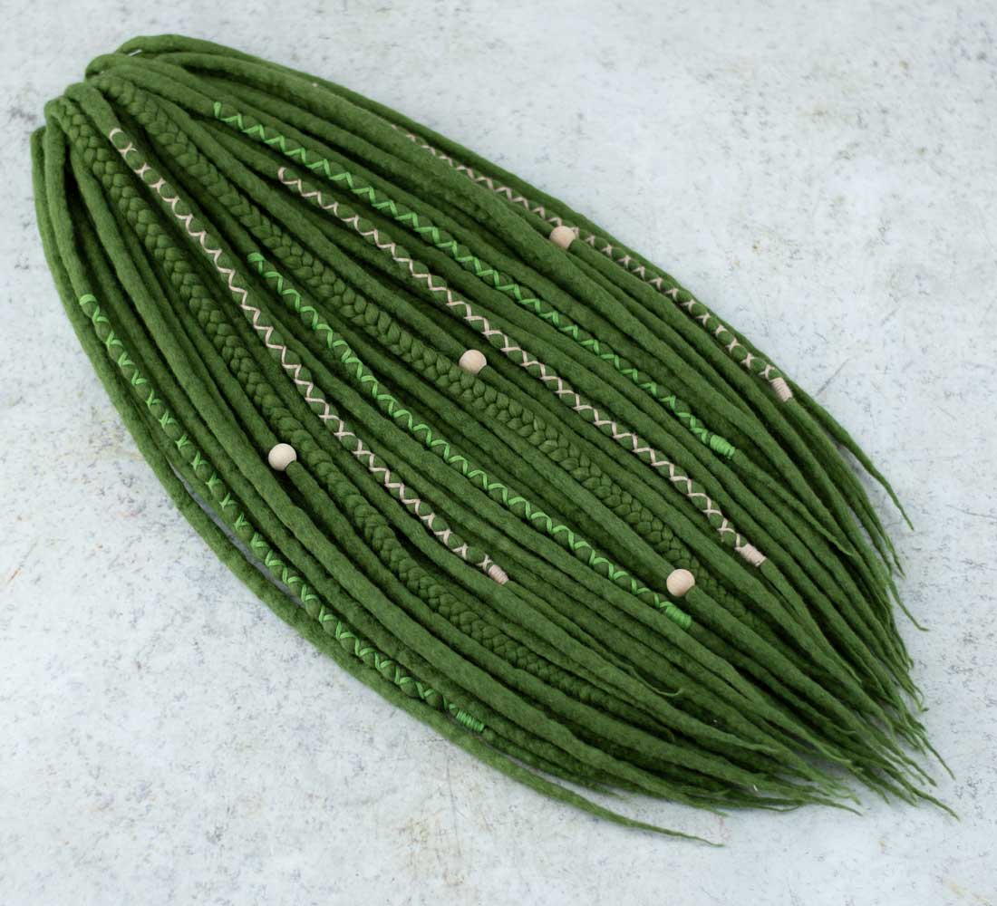This Ivy green wool dread set will be your favorite hairstyle. Thanks to the extra soft merino wool, the dreadlocks are skin-friendly and allow your scalp to breathe. They are super soft and lightweight.