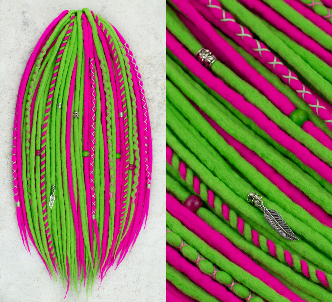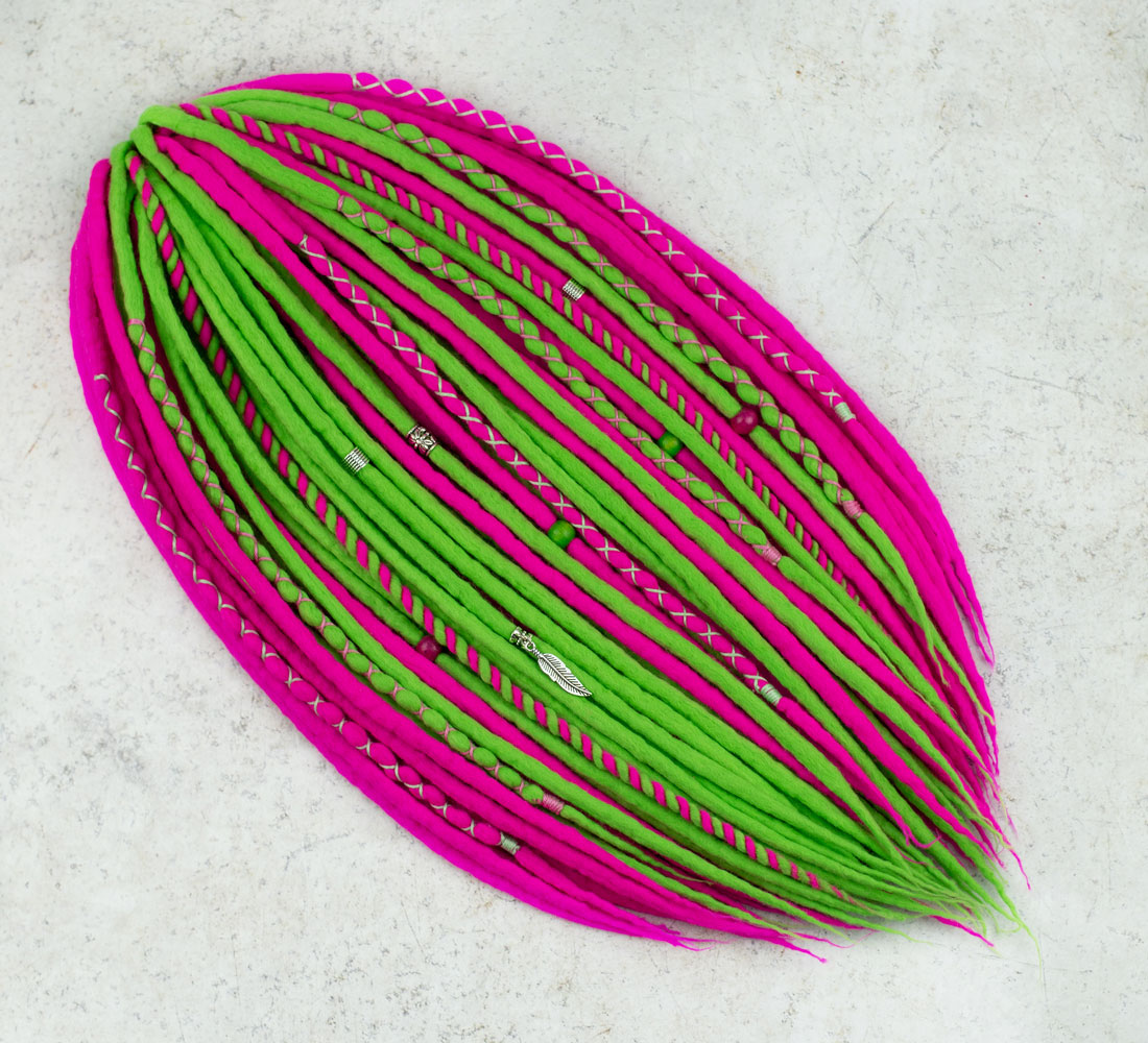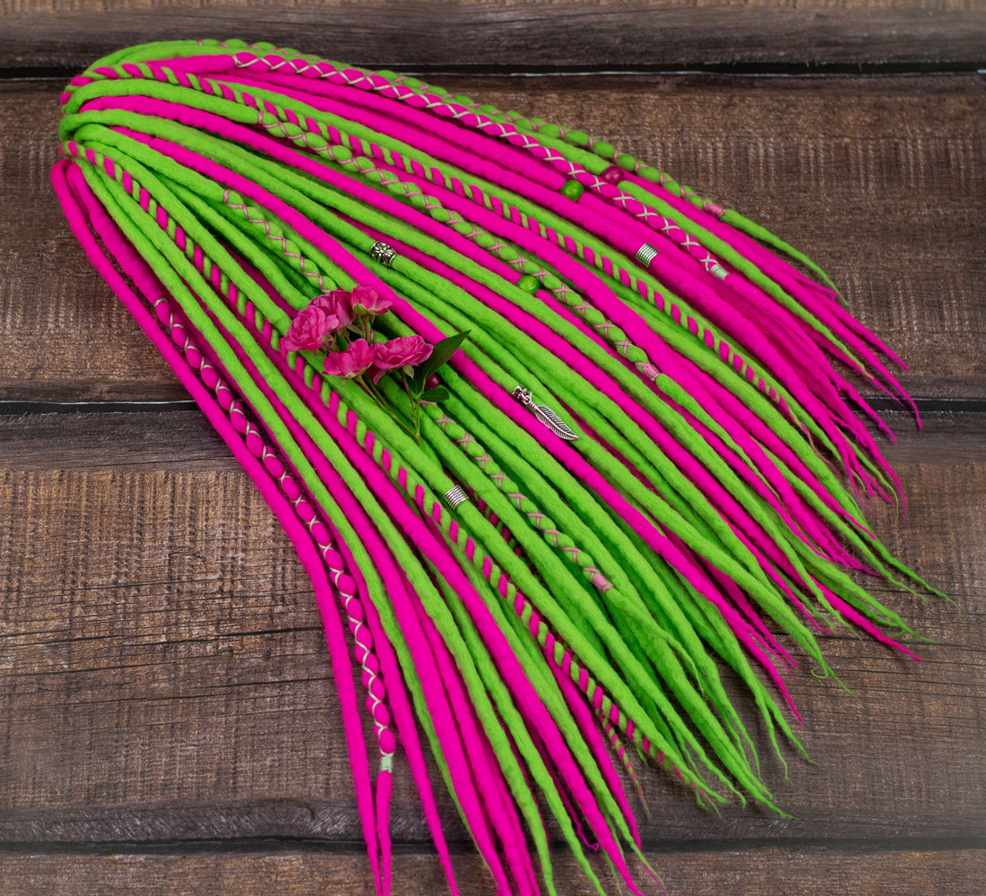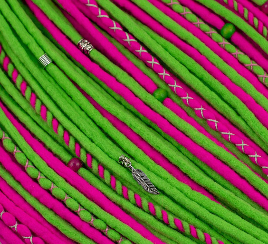 Unleash your inner vibrance with the "Joyful" mix of green and neon pink wool dreads! This stunning color combination is more than just eye-catching; it's a celebration of emotion and self-expression. The green symbolizes growth, harmony and renewal, while the neon pink radiates energy, passion and vibrancy. Together they create a dynamic blend that represents the joy and excitement of life.