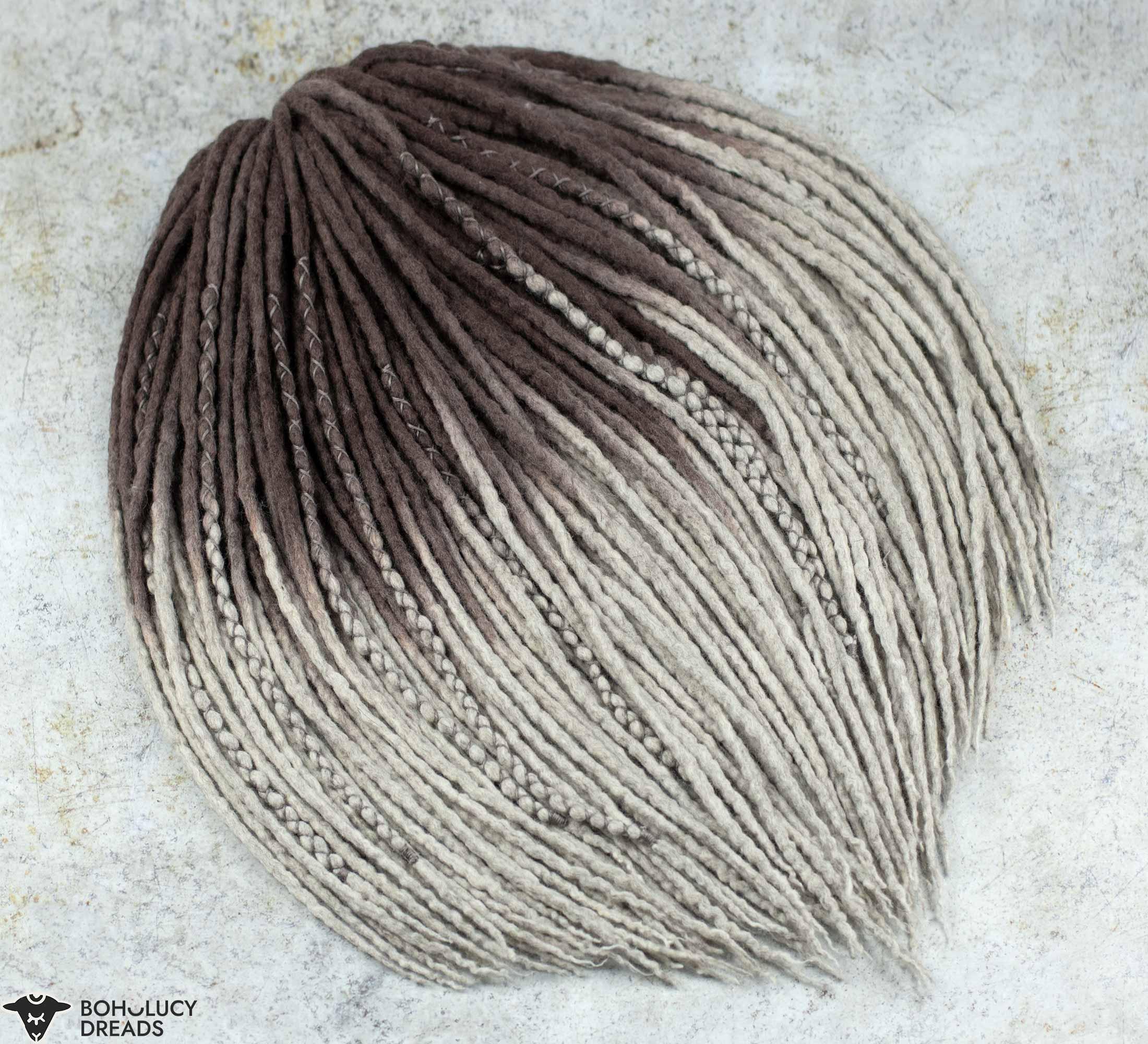These Latte wool dreadlocks evoke a connection with nature. This set's base is natural, undyed beige wool. Different shades of wool have been combed together to create this amazing color. The greyish-beige ends provide a smooth transition to the dyed dark brown roots. These felted wool dreadlocks have a wonderful natural curly style thanks to the fine merino wool.