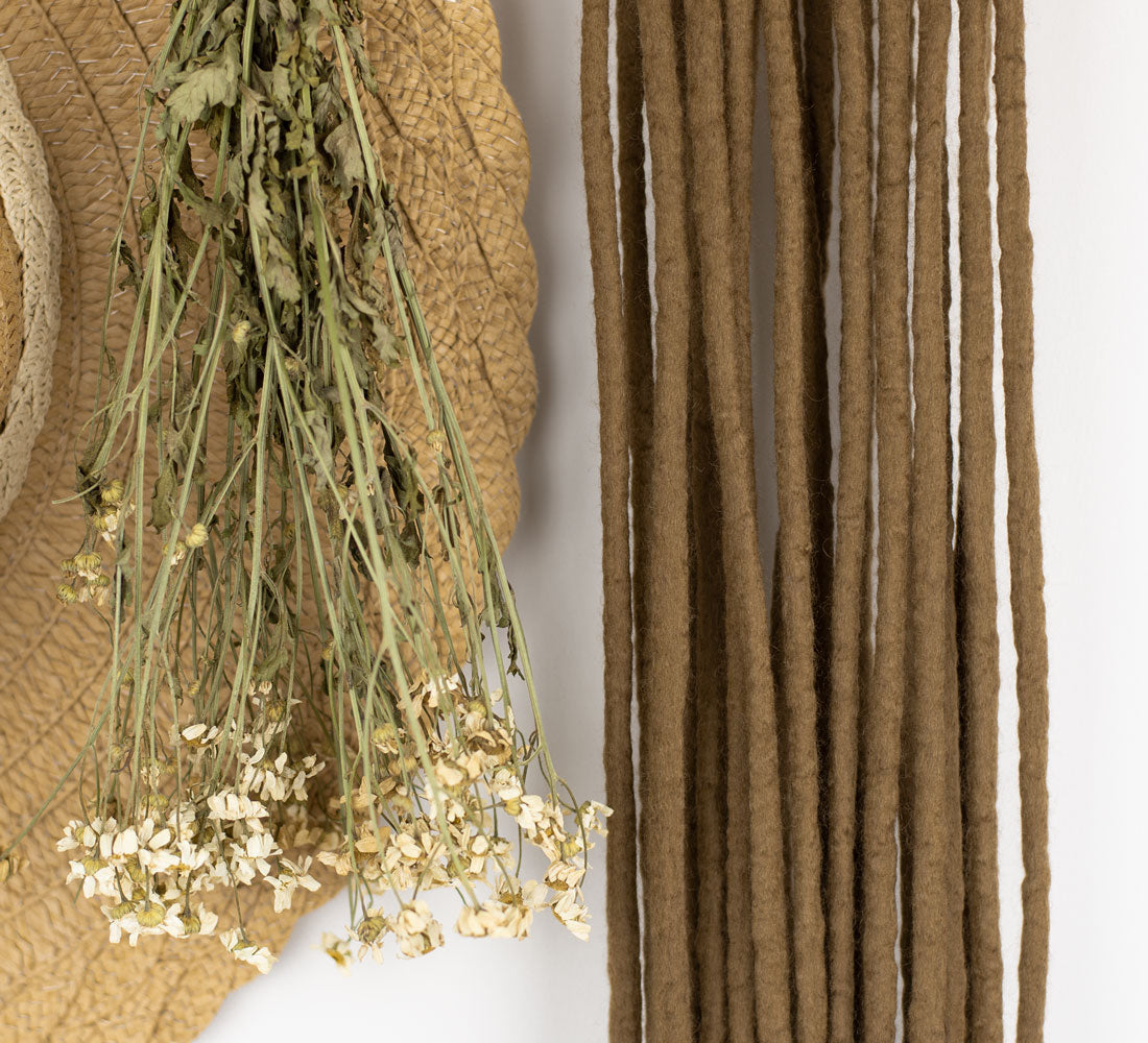The mill dyed wool and yarn is toxic free, and complies with the OEKO-TEX 100 and GOTS requirements. We use high quality mulesing free extra fine merino wool for dreads. The dreadlocks are decorated with cotton yarn. We make the dreads with wet felting technique.