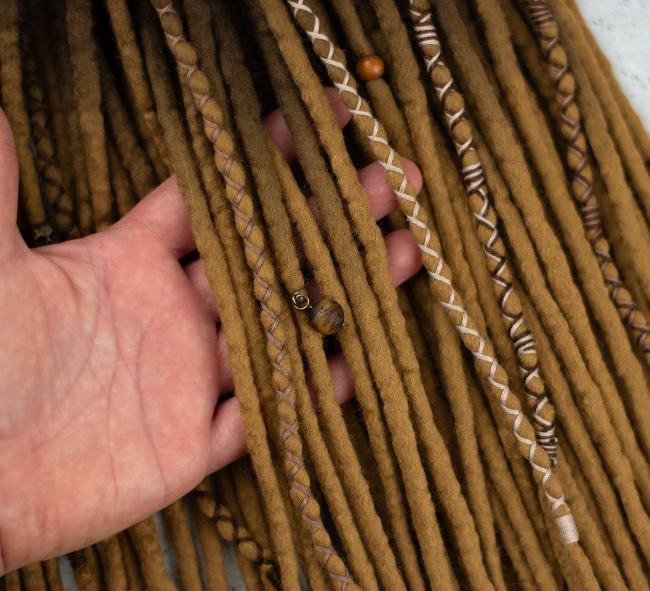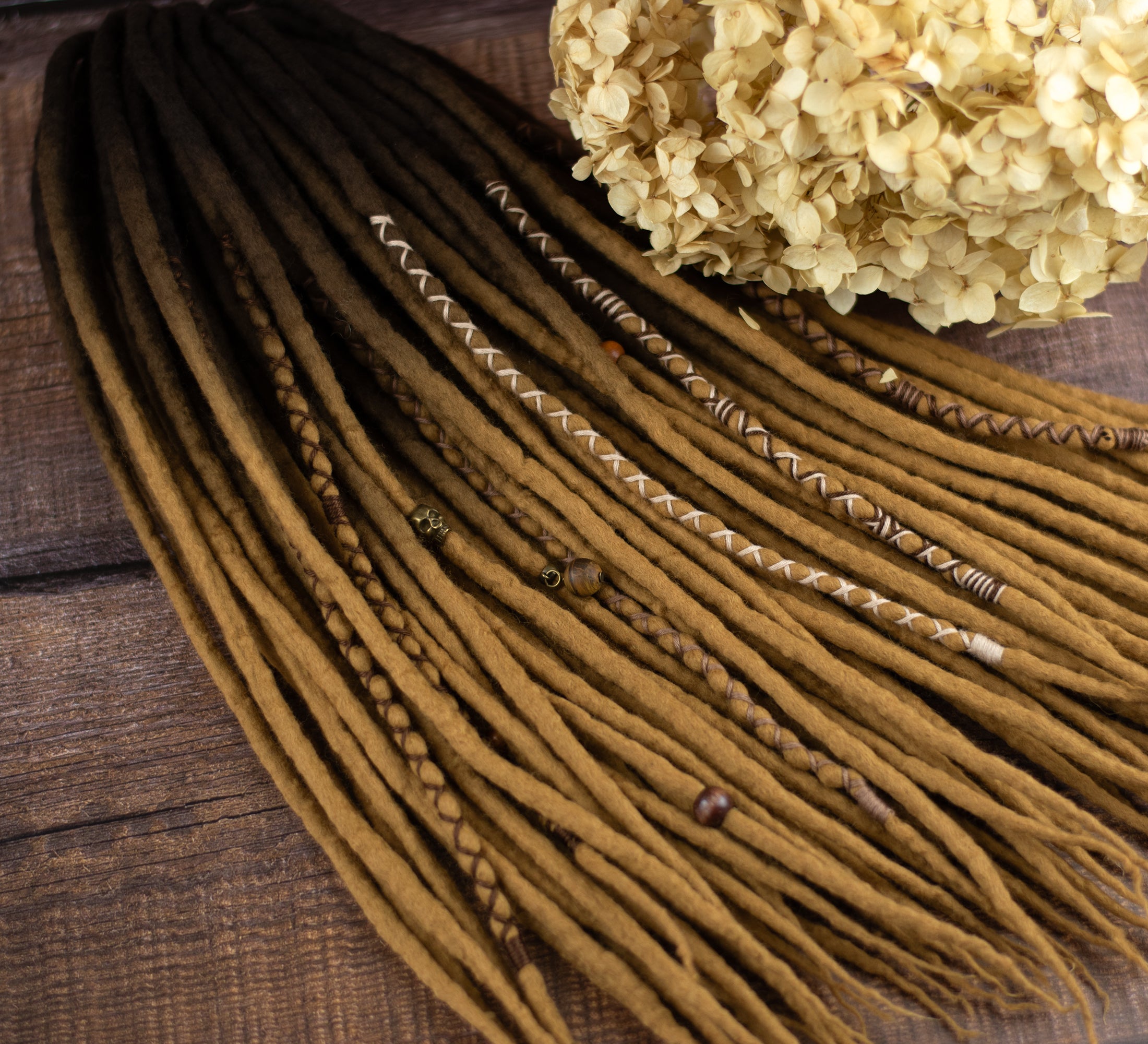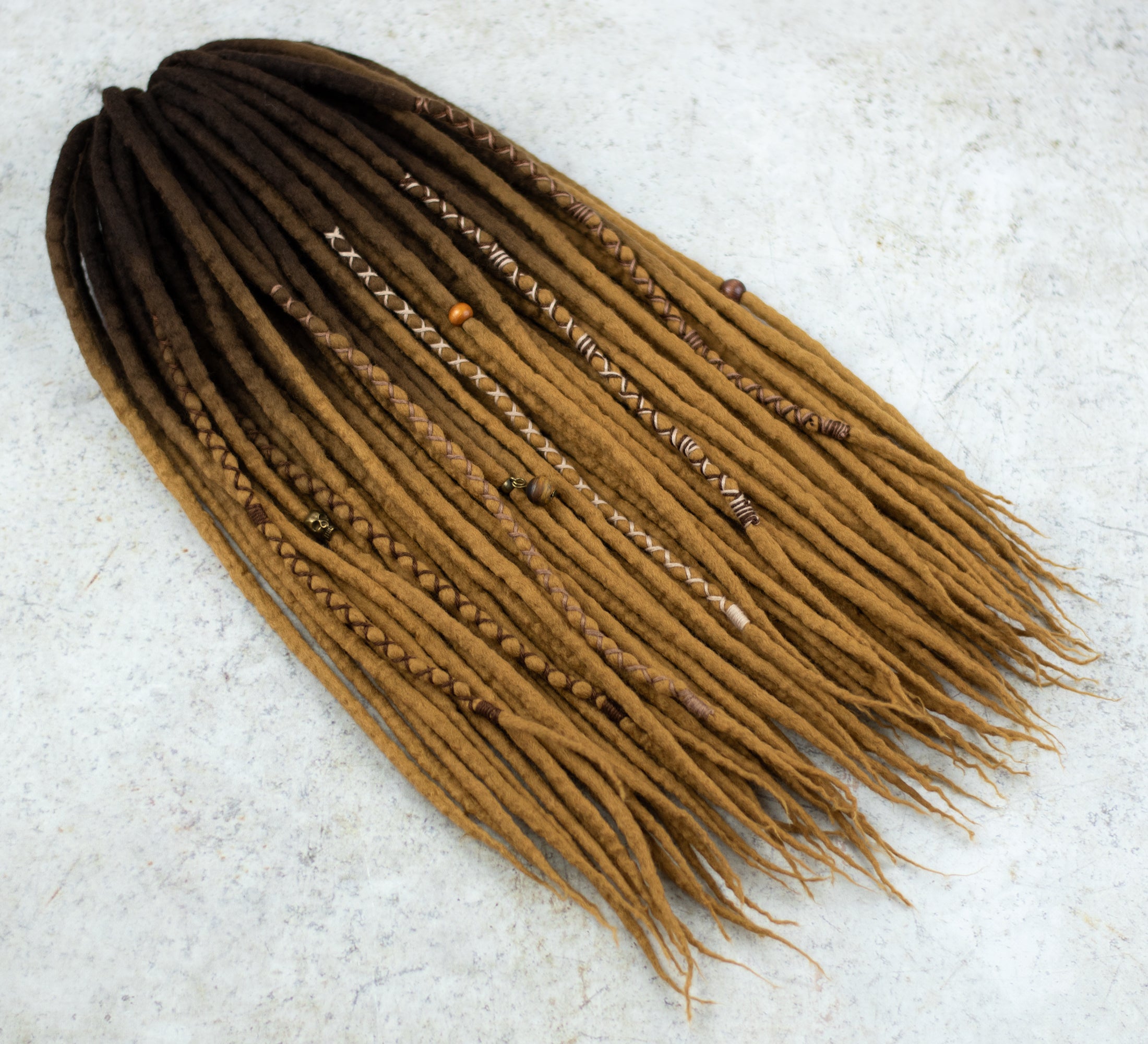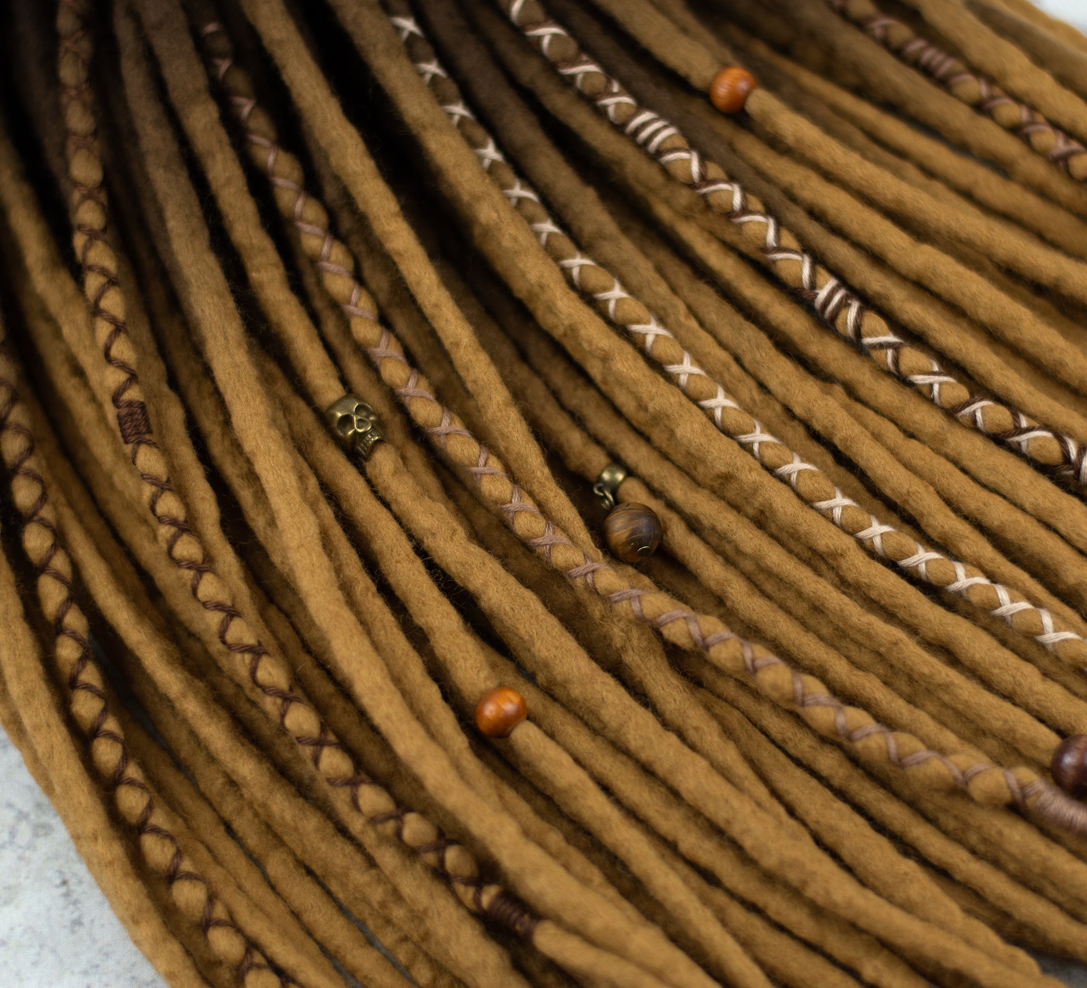 The Old gold ombre wool dread set offers both single and double-ended versions, handmade from extra-soft merino wool for a non-itchy, comfy wear. Hand-dyed with coffee ombre roots.