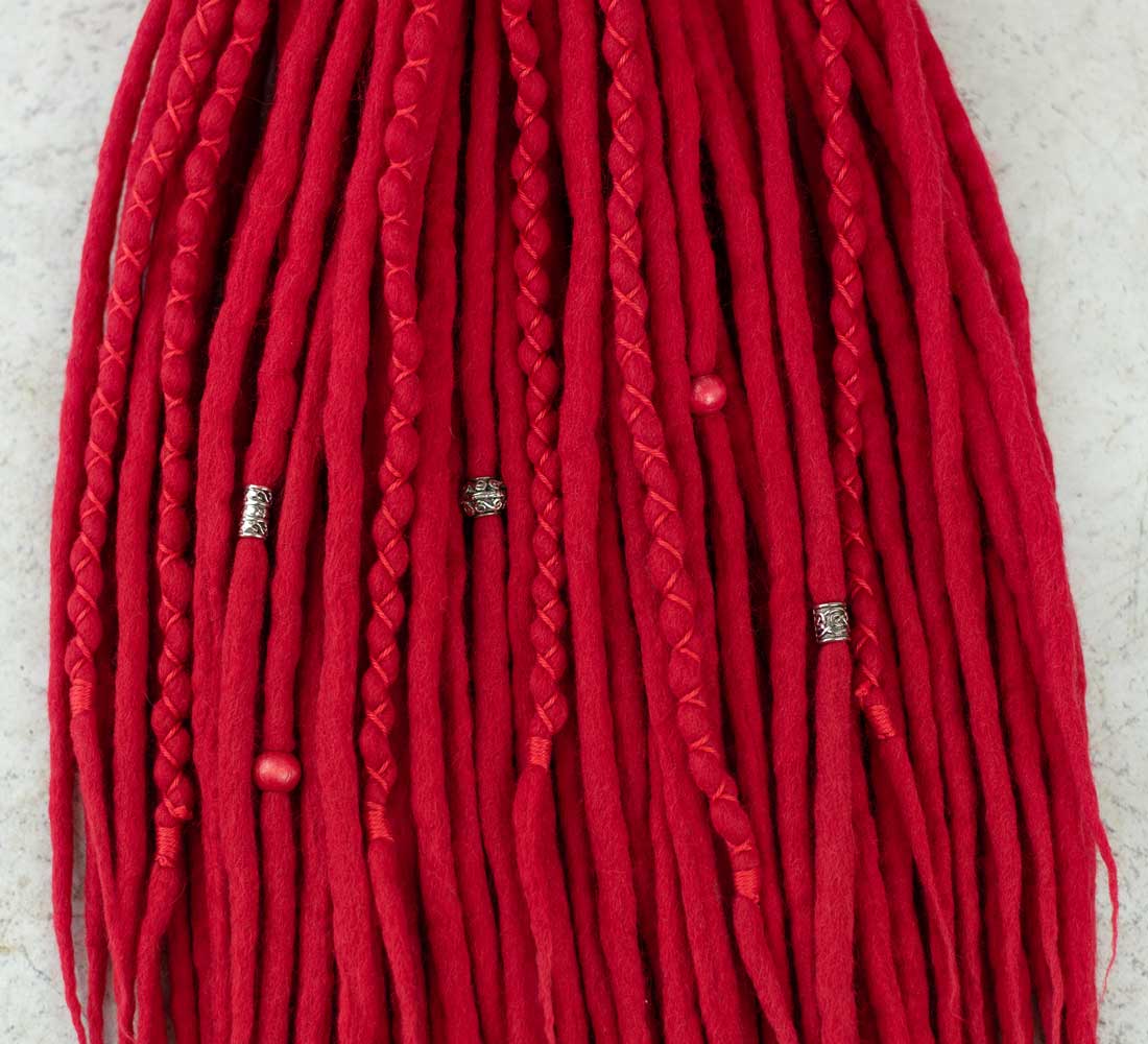 Our Poppy red wool dreads are designed for a standout look! Made from 100% natural wool, these dreadlocks offer a lightweight and breathable texture that's perfect for all-day wear. Wool is a fantastic material for dreadlock extensions due to its natural softness, durability and easy styling. Your hair extensions will stay voluminous and vibrant without being too heavy on your scalp.