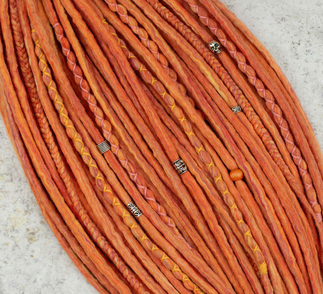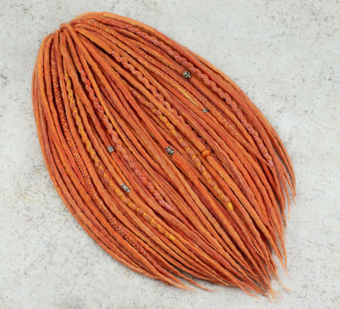 Our Pumpkin blended orange wool dread extension set is made from extra fine merino wool for a comfortable and unique look that will grab attention wherever you go.