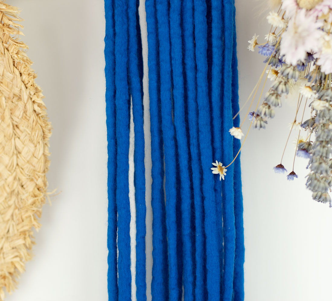 The mill dyed wool and yarn is toxic free, and complies with the OEKO-TEX 100 and GOTS requirements. We use high quality mulesing free extra fine merino wool for dreads. The dreadlocks are decorated with cotton yarn. We make the dreads with wet felting technique.
