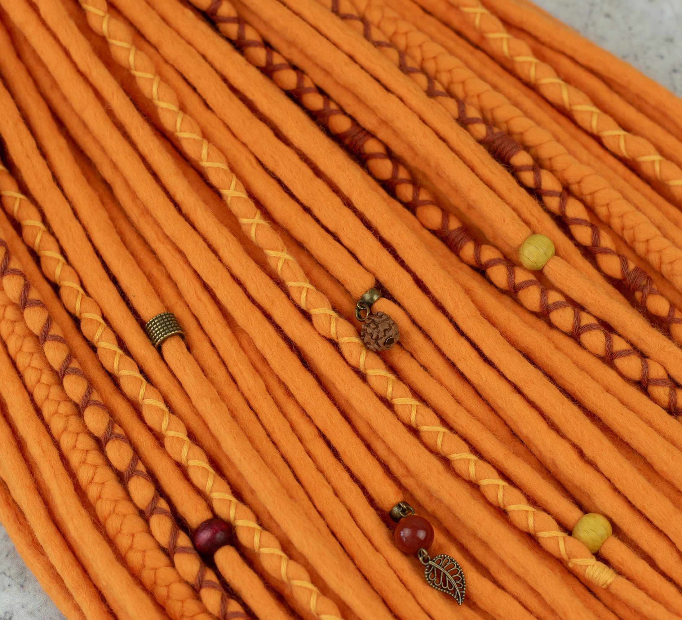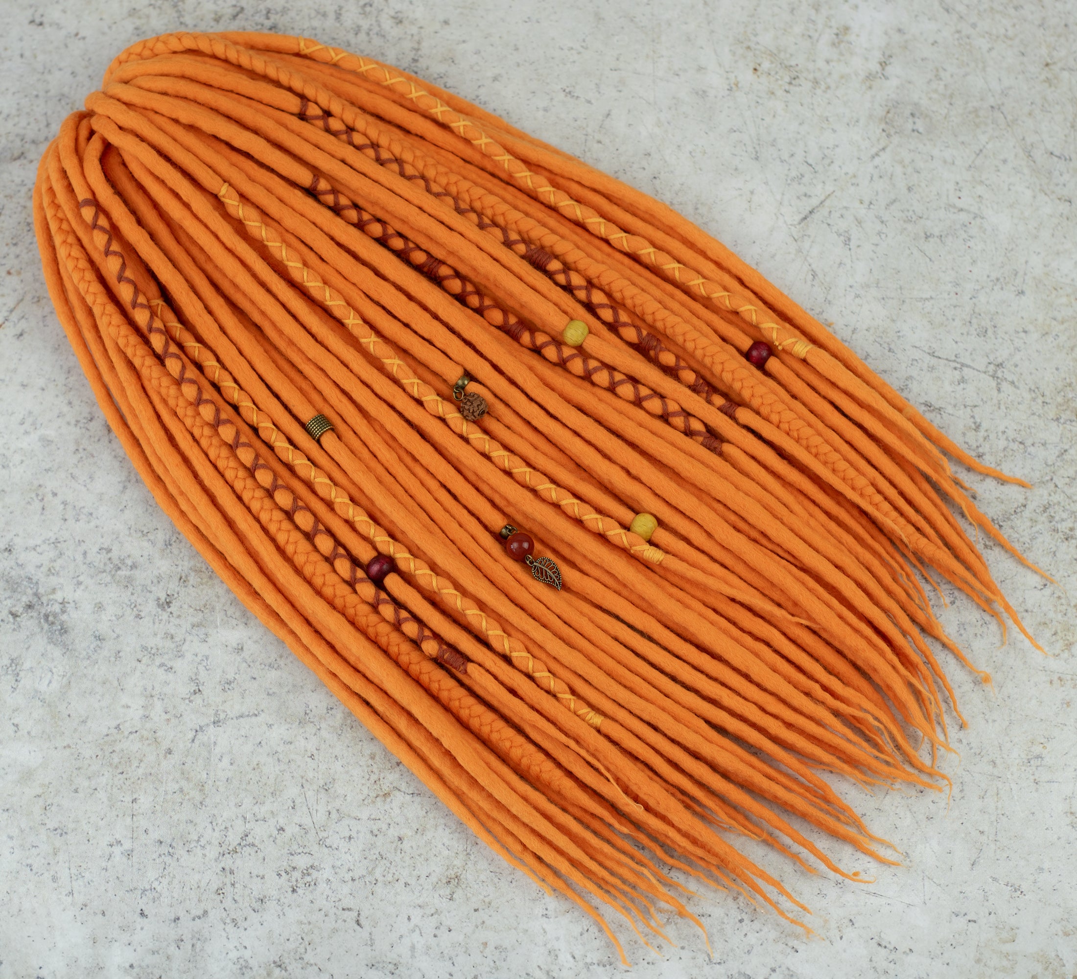 Introducing the Sea Buckthorn wool dread set, a vibrant and natural hair accessory perfect for those looking for a unique and eco-friendly style. Handmade from extra soft merino wool, the dreadlocks combine natural materials' beauty with wool's comfort.