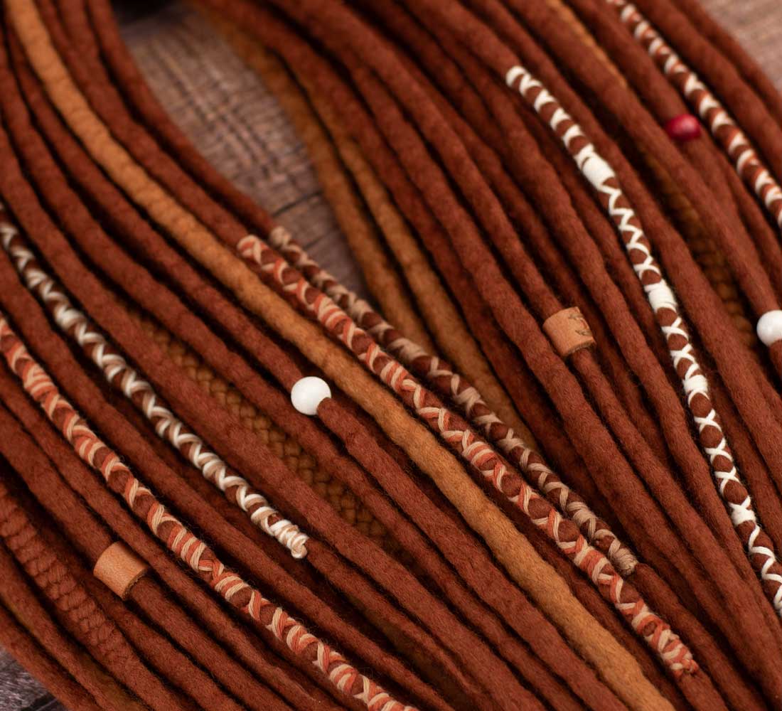 Capture the essence of autumn with our Sienna Viking wool dreads. This reddish-brown shade is perfect for anyone looking for a warm, unique hairstyle. The extra soft merino wool ensures comfort and wearability, while the braids and X-decorated locks add an artistic touch, making this deadlock extension set the perfect blend of elegance and style.
