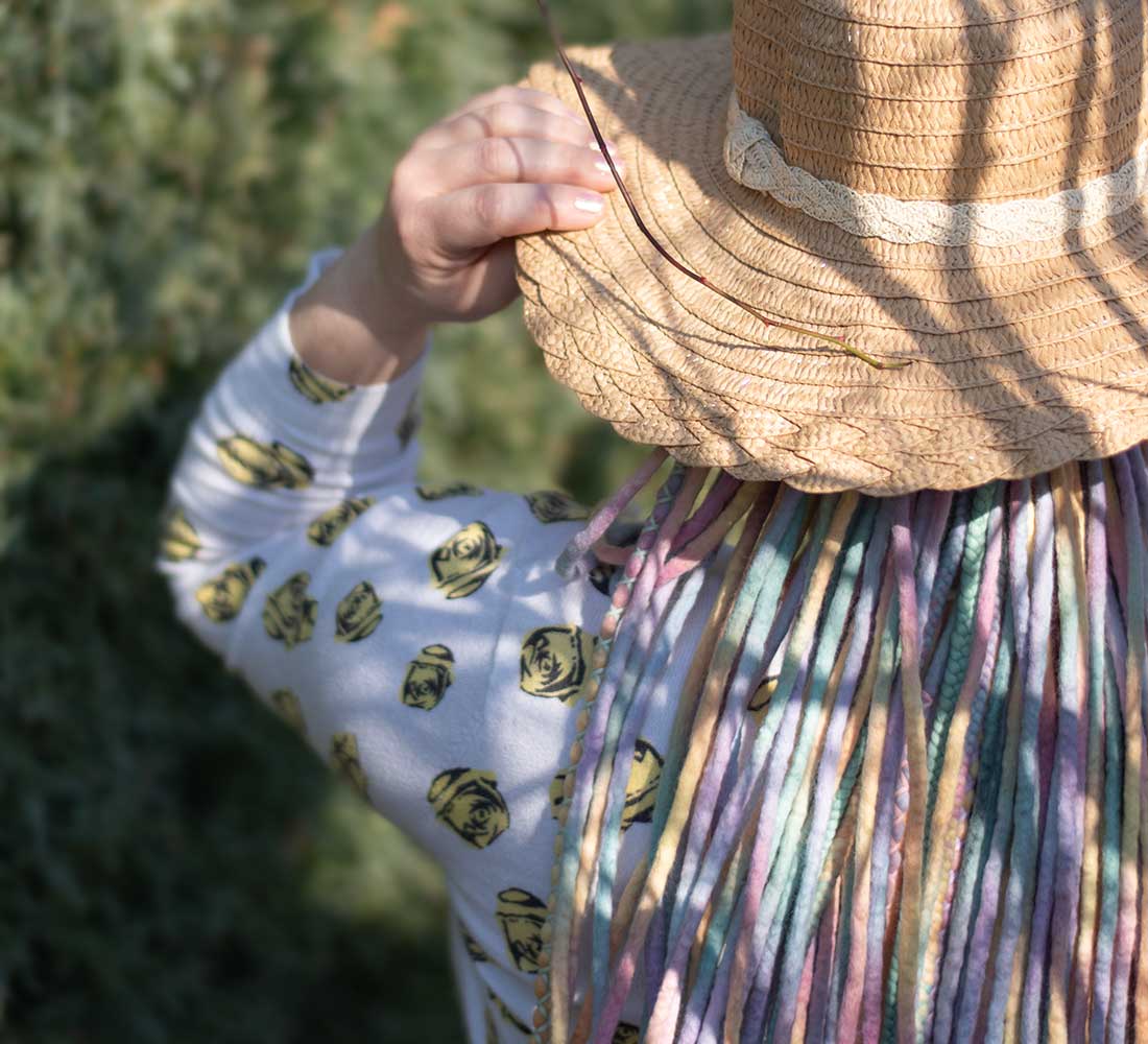 The mill dyed wool and yarn is toxic free, and complies with the OEKO-TEX 100 and GOTS requirements. We use high quality mulesing free fine merino wool for dreads. The dreadlocks are decorated with cotton yarn. We make the dreads with wet felting technique.