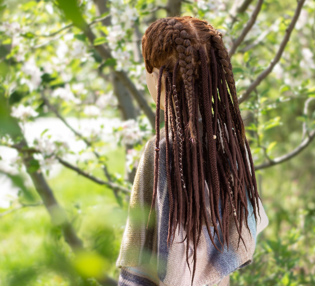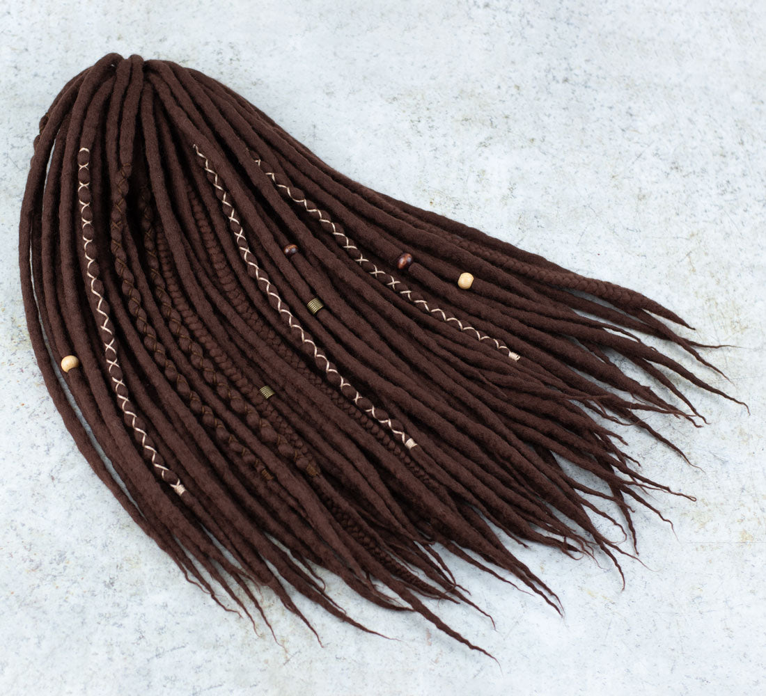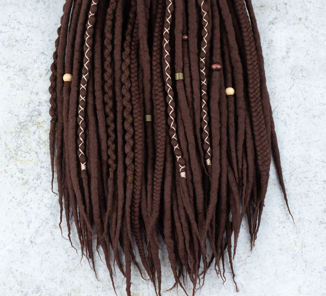 We make these Chocolate brown dreadlocks by hand from extra fine merino wool. The set is decorated with cotton yarn and braids.