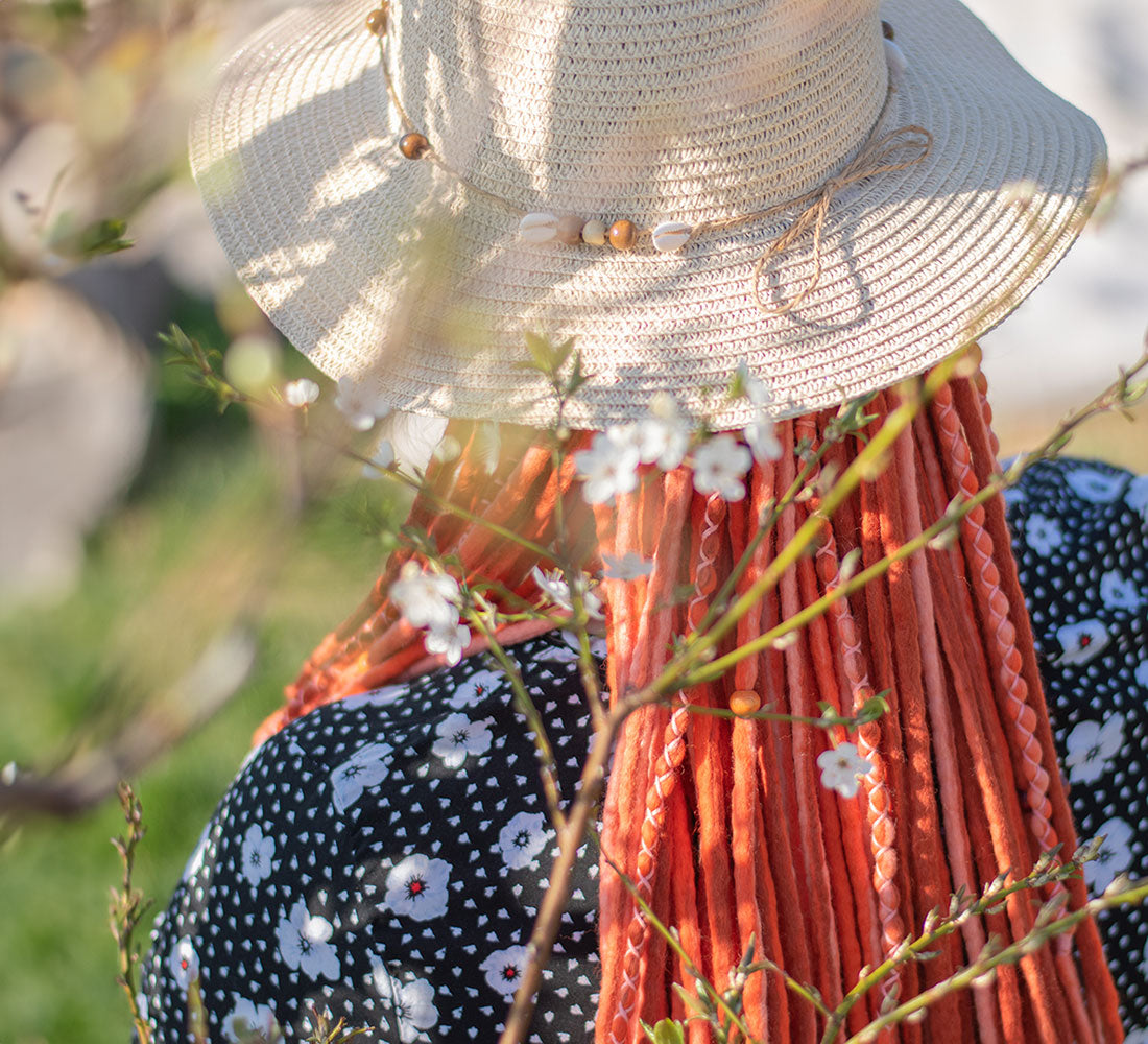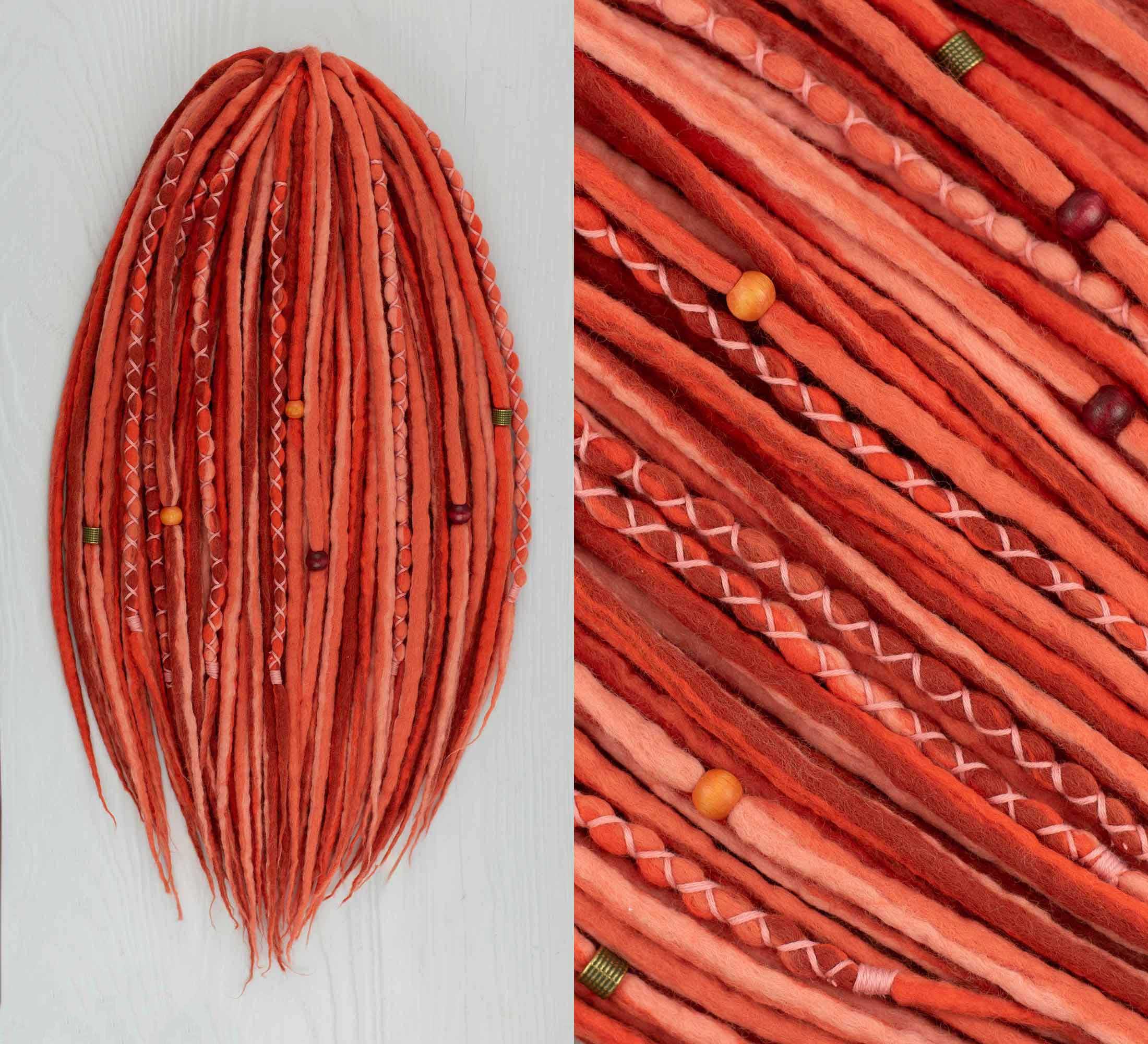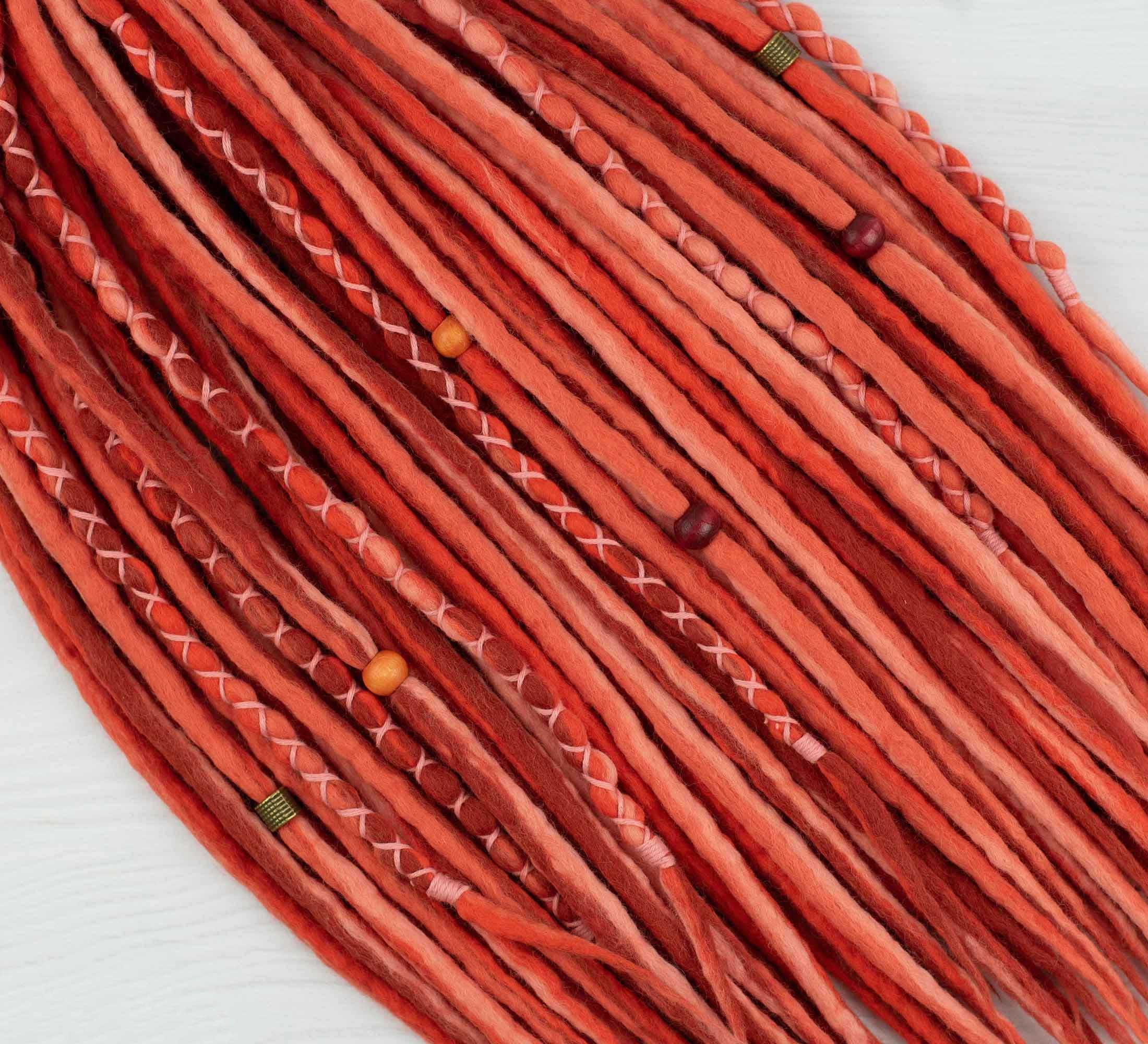 In shades of orange and peach, this boho style wool dreadlock set adds a warm and inviting energy to any hairstyle. The vibrant shades exude a positive mood, evoking a sense of joy, creativity and adventure. These colors perfectly complement the bohemian aesthetic, creating a free-spirited and whimsical look.